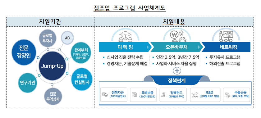 지난해 처음 도입한 점프업은 업력 7년 이상의 중소기업이 신사업·신시장 진출을 통해 새로운 성장동력을 확보, 글로벌 중견기업으로 성장할 수 있도록 지원하는 사업이다.