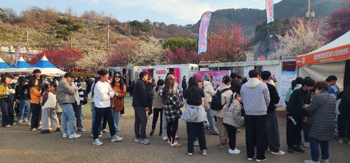 상춘객들이 제25회 광양매화축제 행사장에서 줄을 서고 있다. 광양시 제공 |