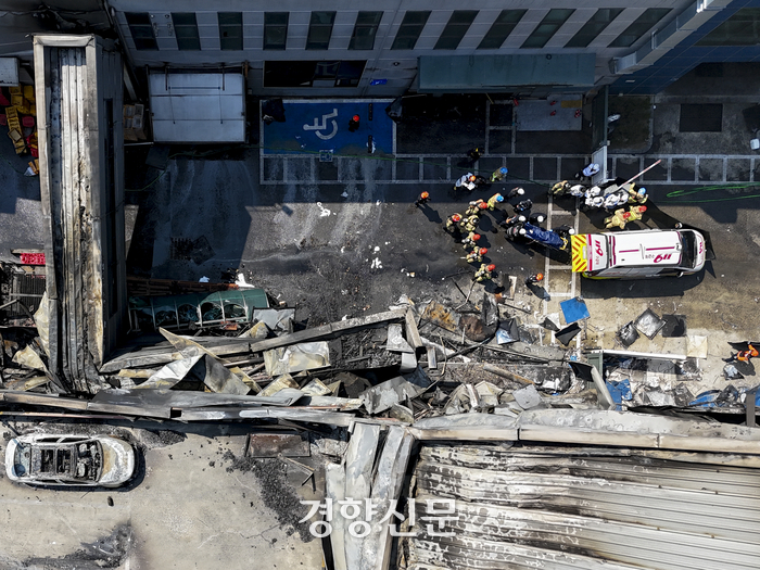 대형 화재가 발생한 대전 대덕구 문평동 자동차 부품 제조 공장에서 지난 21일 소방과 경찰 등 관계자 등이 희생자를 수습하고 있다. 문재원 기자 |