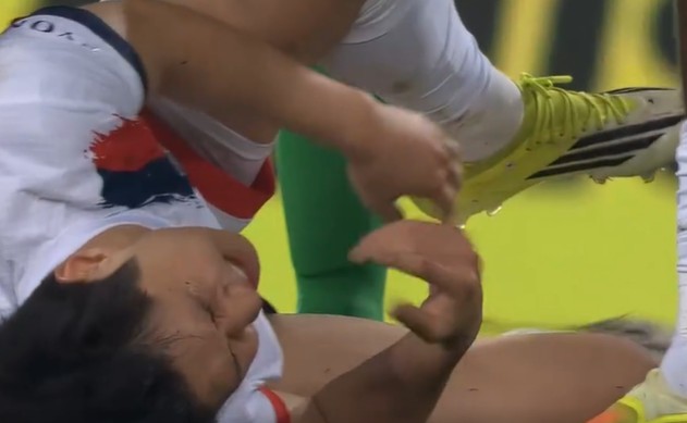 문제의 장면은 그보다 앞선 후반 14분에 발생했다. 패스를 내준 직후, 니스의 미드필더 유수프 은다이이시미예가 이강인의 왼쪽 발목 아킬레스건 부위를 거칠게 밟았다. 강한 충격을 받은 이강인은 그대로 쓰러져 발목을 움켜쥐며 극심한 고통을 호소했다.