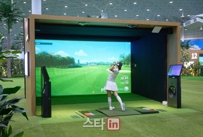 골프존 시티골프 중국 2호 연길점에서 한 여성 골퍼가 게임을 즐기고 있다. (사진=골프존) |