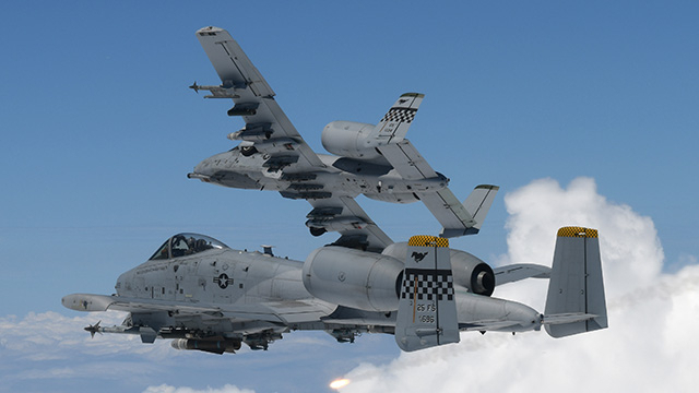그럼에도 나름대로 강점이 있다. 저공에서 저속 비행할 수 있는 능력이다. 과연 A-10 썬더볼트 공격기의 위력은 어떨까. 저공으로 돌진하면서 열화우라늄으로 처리한 ‘철갑소이탄’을 발사하는 30㎜ 회전식 기관포를 퍼붓는 모습을 빗대어 성난 ‘혹멧돼지(Warthog)’라는 별칭도 갖고 있다. 전차나 장갑차를 관통할 수 있는 위력을 가졌다.