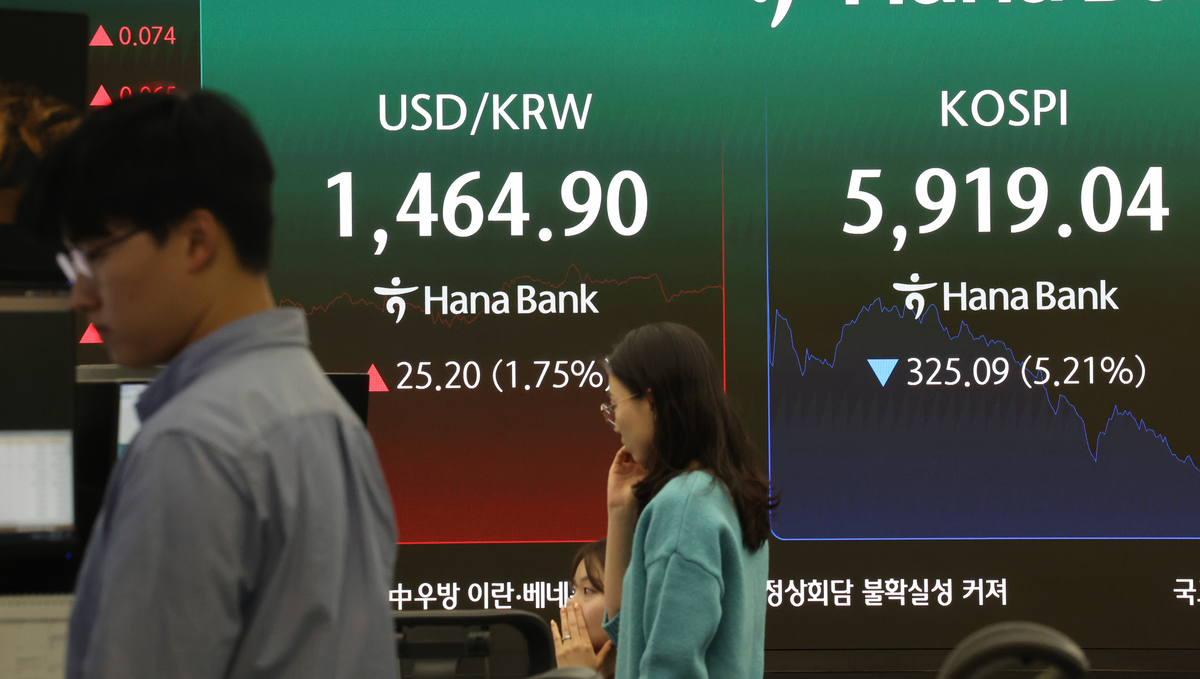 23일 한국거래소에 따르면 코스피는 전 거래일 대비 201.05포인트(3.48%) 내린 5580.15에 장을 시작했다. 이후 낙폭이 확대되며 오전 9시 25분 기준 262.79포인트(4.55%) 하락한 5518.41을 기록하고 있다.
