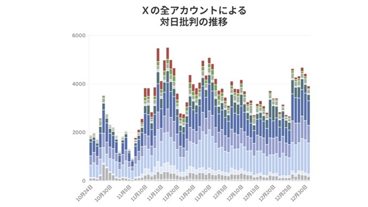 요미우리와 사카나AI는 다카이치 총리의 해당 발언이 있기 일주일 전인 지난해 10월 24일부터 올해 1월 17일까지 엑스에서 일본어, 영어, 중국어로 쓰인 대일 비판 게시물 32만 건을 추출했고 나머지 분석 대상은 웨이보에서 뽑았습니다.