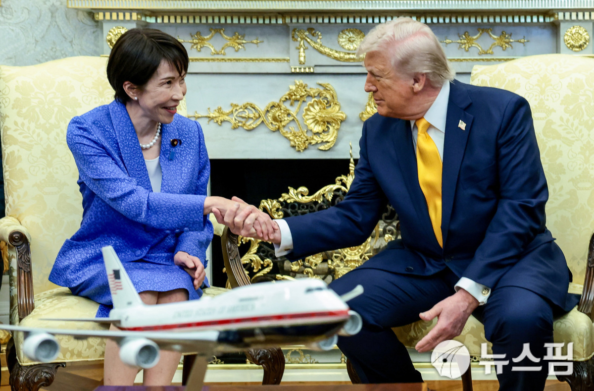 도널드 트럼프 미국 대통령이 워싱턴 D.C. 백악관 집무실에서 다카이치 사나에 일본 총리와 악수하고 있다. [사진=로이터 뉴스핌] |