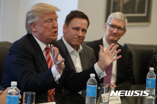 【뉴욕=AP/뉴시스】도널드 트럼프 미국 대통령 당선인이 14일(현지시간) 뉴욕 트럼프타워에서 실리콘밸리 리더들과 만나고 있다. 트럼프의 왼쪽으로 피터 틸 페이팔 설립자, 팀 쿡 애플 최고경영자가 앉아 있다. 2016.12.15 |