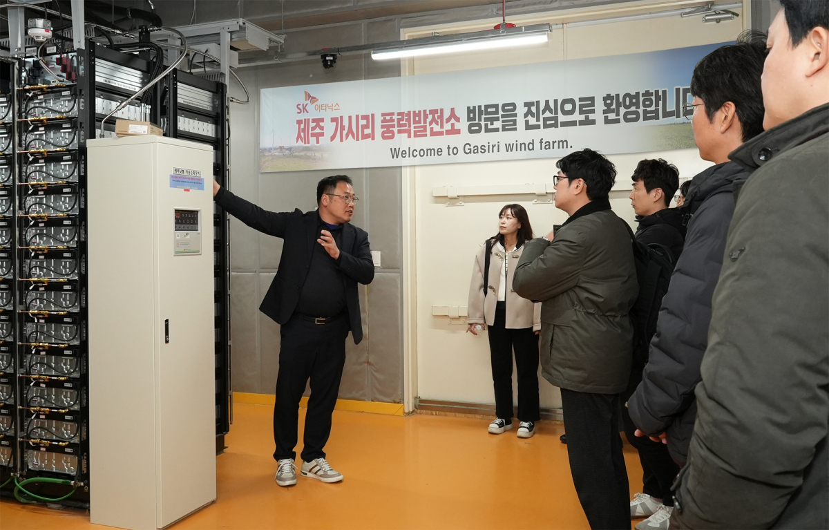 하나은행은 지난 20일 제주도 일대의 신재생에너지 발전단지를 방문해 생산적 금융 실행력 강화를 위한 '국가 첨단전략산업 현장연수'를 실시했다. 이날 현장연수에 참여한 하나은행 심사역과 기업금융전문역(RM) 직원들이 제주도 서귀포시 소재 가시리풍력발전소에서 SK이터닉스 직원으로부터 에너지저장시스템(ESS)에 대한 설명을 듣고 있다. [사진=하나은행] |