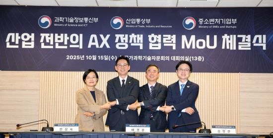 기사의 이해를 돕기 위한 자료 사진. 지난해 10월 서울 종로구 과학기술자문위원회 회의실에서 열린 '산업 전반의 AX 정책 협력 MOU 체결식에서 행사에 참석한 한성숙 중소벤처기업부 장관, 배경훈 과기부총리 겸 과학기술정보통신부 장관, 임문영 국가인공지능전력위원회 부위원장, 김정관 산업통상부 장관이 MOU 체결후 기념사진을 찍고 있다. 사진 왼쪽부터. 윤동주 기자 |