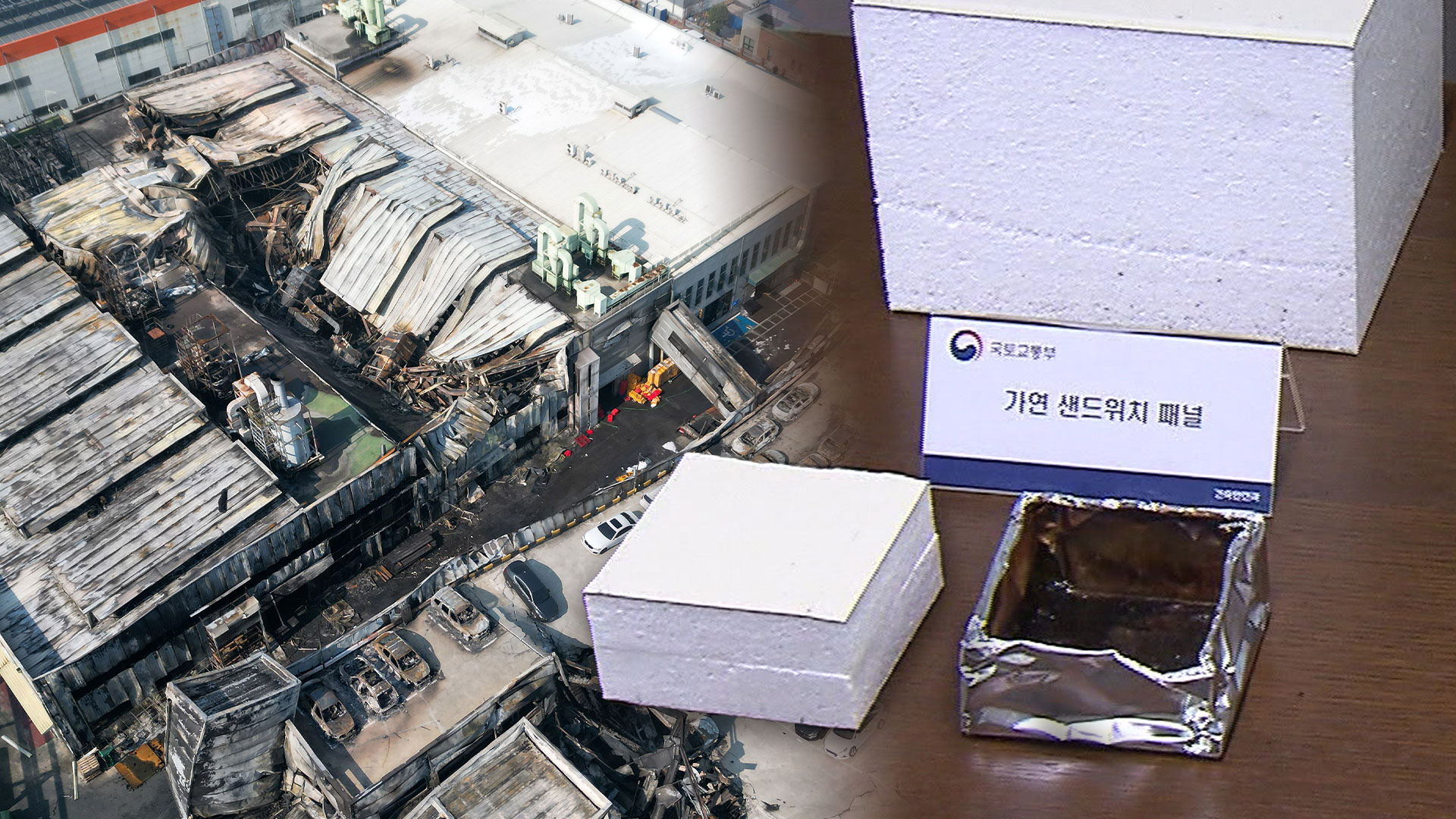 철판 사이에 스티로폼 등을 넣은 샌드위치 패널은 시공이 빠르고 비용이 저렴해 널리 사용되지만, 화재 발생 시 불이 잘 붙고 유독 가스가 많이 발생한다는 단점이 있습니다.