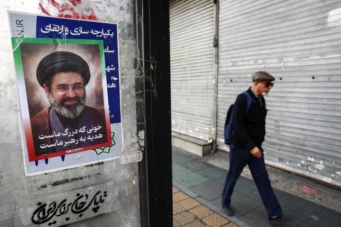 26일 이란 최고 지도자 모즈타바 하메네이의 사진이 붙어 있는 테헤란 거리를 한 남성이 지나가고 있다. WANA로이터연합뉴스 |