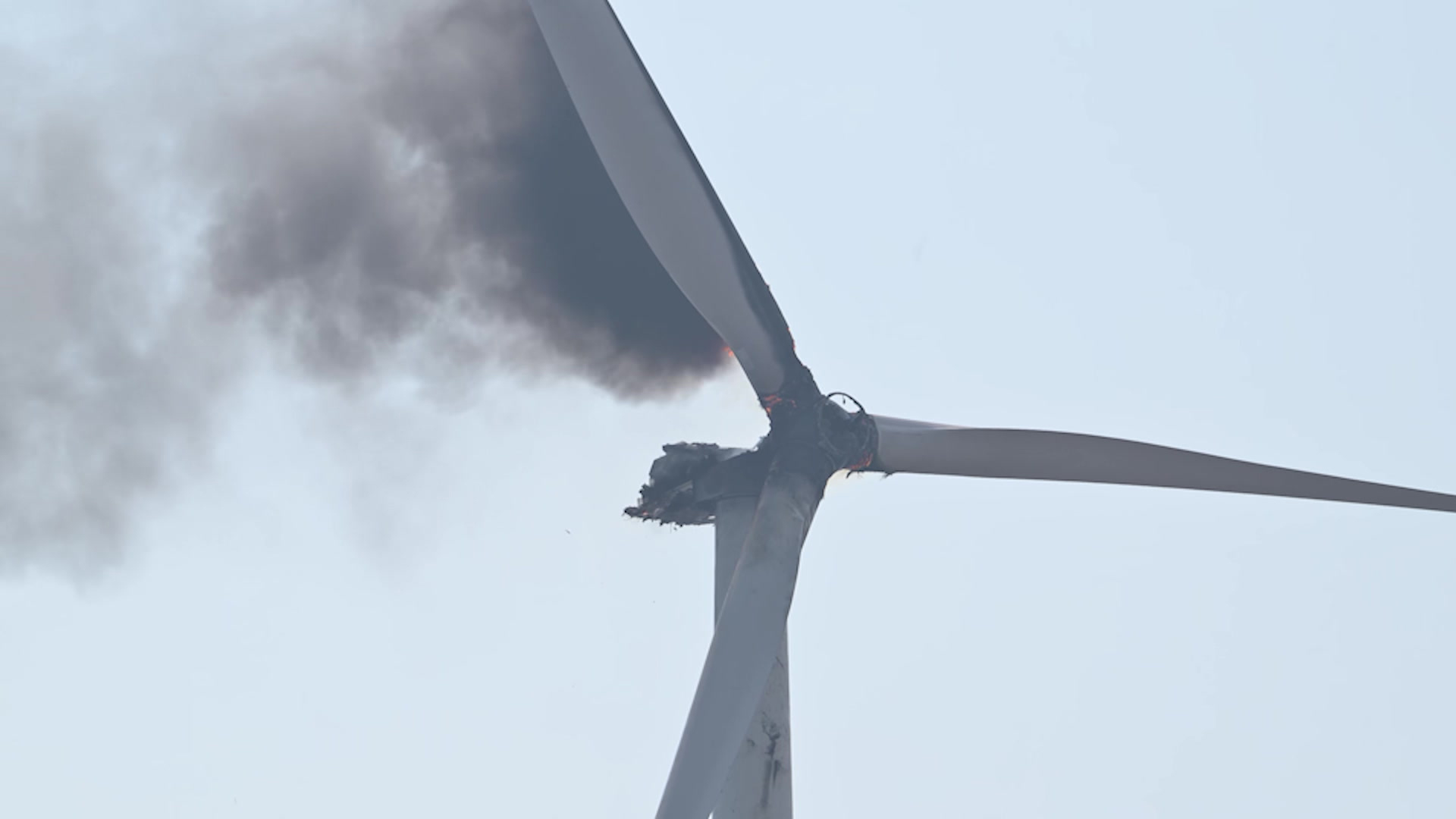 멈춰선 풍력발전기 날개에서 검은 연기가 계속 솟아 오릅니다.