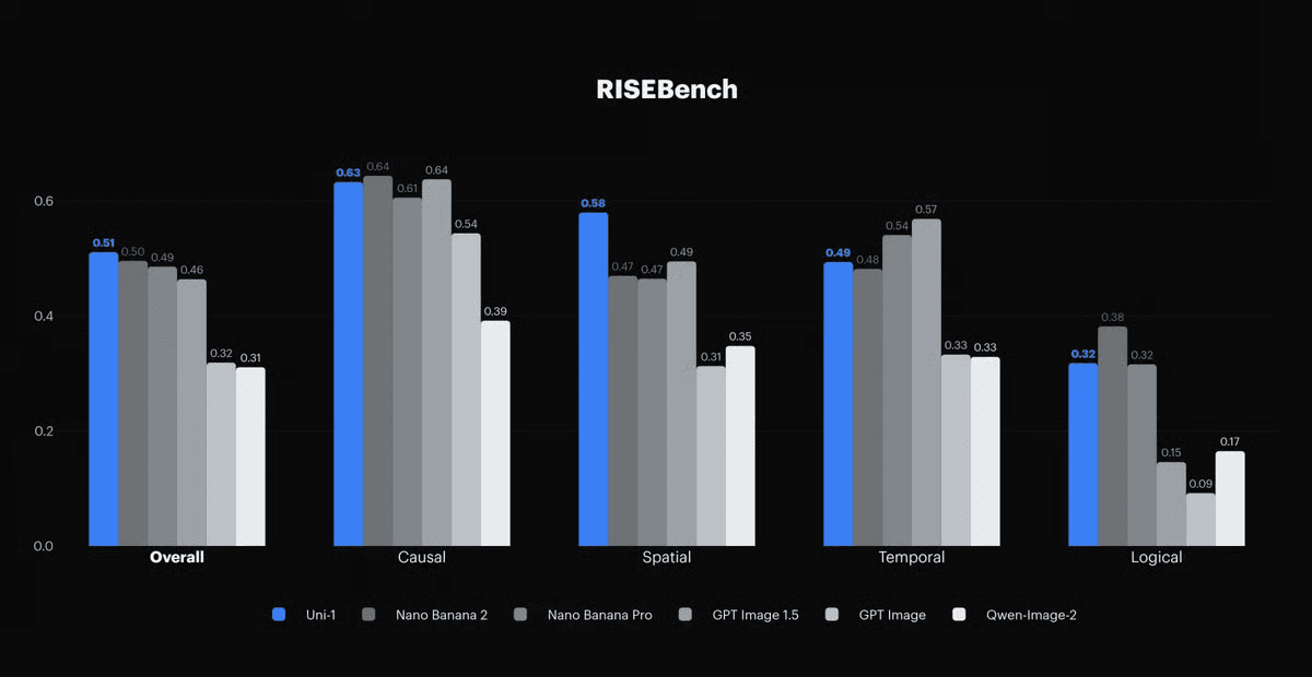 추론 기반 이미지 편집 벤치마크인 '라이즈벤치(RISEBench)'에서 0.51 점수를 기록하며 '나노 바나나 2(0.50)'와 'GPT 이미지 1.5(0.46)'를 앞섰다.