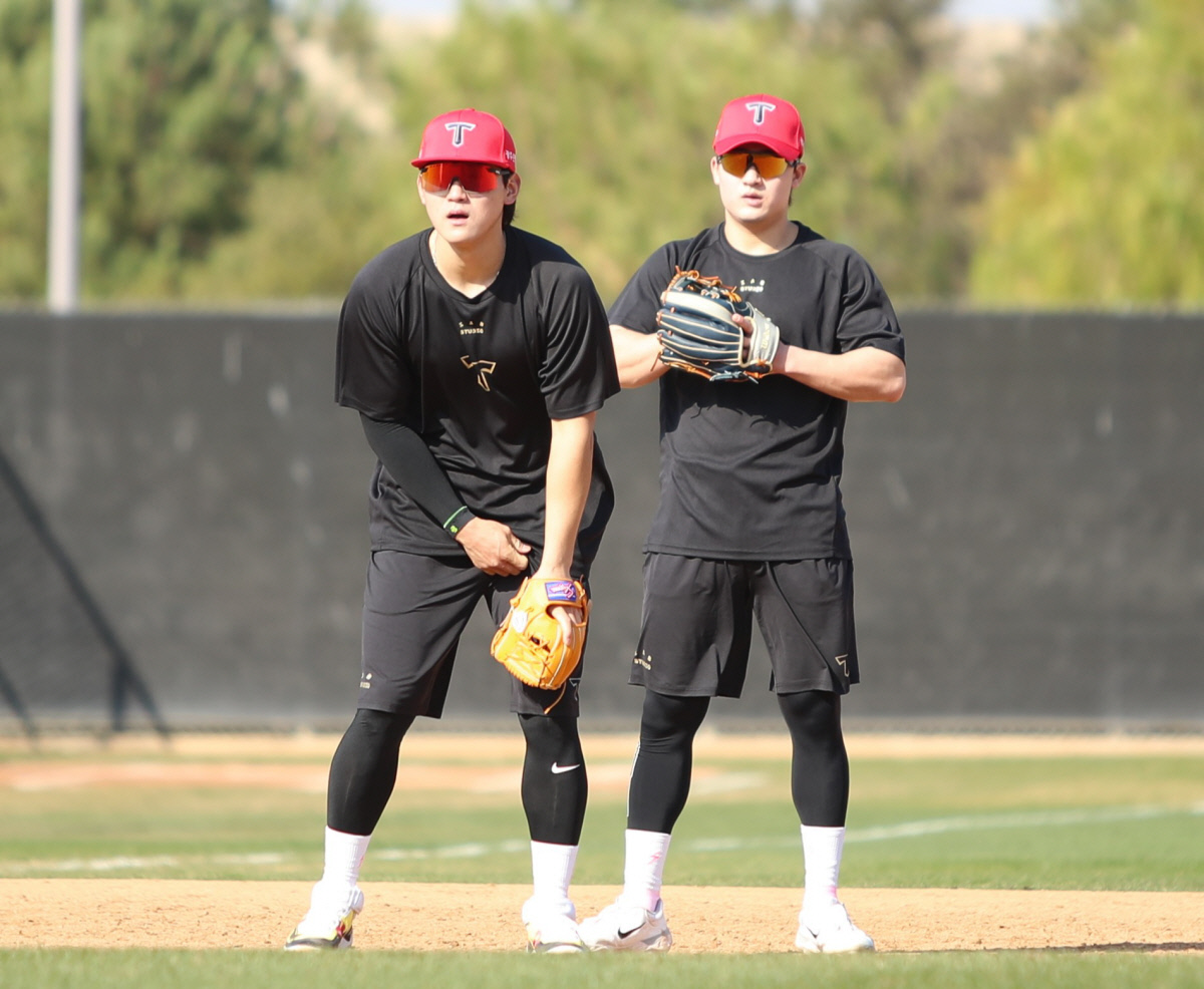KIA 윤도현(오른쪽)과 김도영이 스프링캠프에서 함께 내야 수비 훈련을 하고 있다. KIA 타이거즈 제공 |