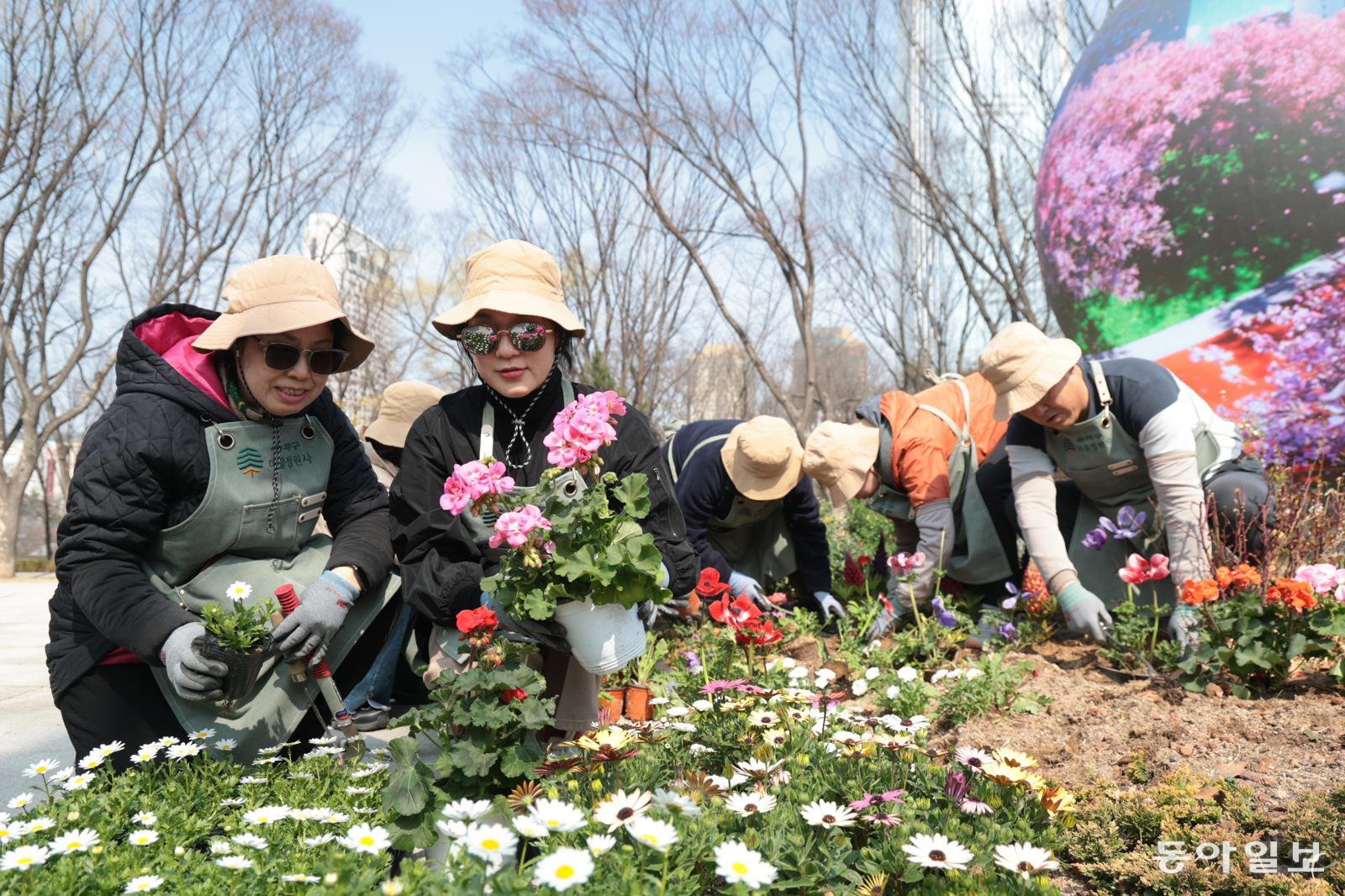 24일 서울 송파구 석촌호수 서호에 있는 미디어 아트 조형물 더 스피어 인근에서 마을정원사들이 봄을 맞아 꽃을 심고 있다. 마을정원사는 지자체 교육을 이수하고 지역 녹지 관리에 참여하는 정원 관리 활동가를 뜻한다.
