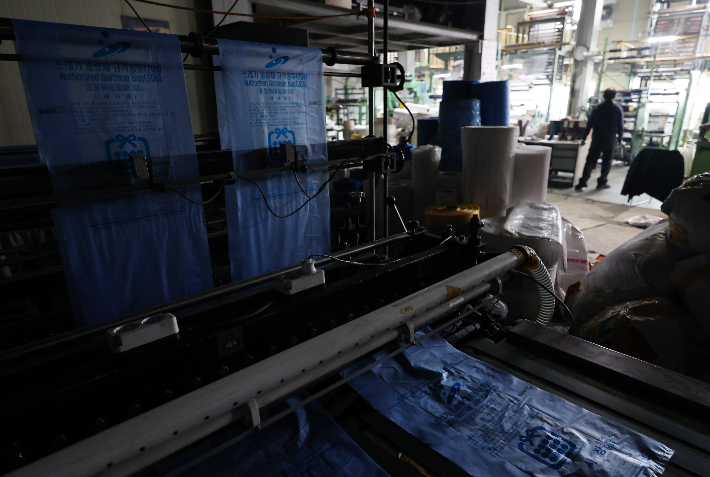 24일 중동 사태에 따른 폴리에틸렌 등 원료 수급 불안 영향으로 최근 일시적으로 인원 감축 운영에 들어간 경기 안산시의 한 비닐봉투, 종량제 봉투 제조 공장 내 가공 작업대의 불이 꺼져있다. 연합뉴스 |