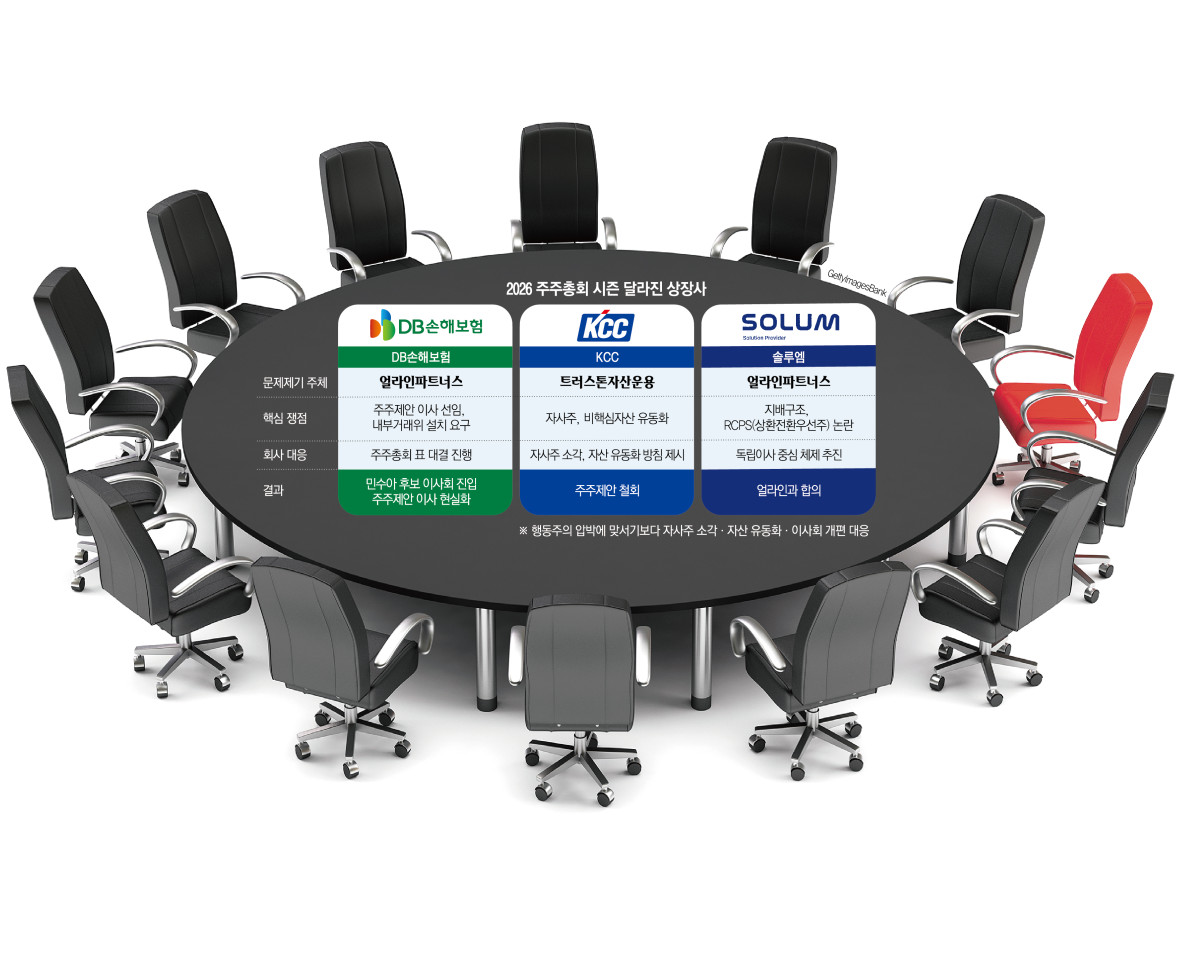올해 주총 시즌 변화는 행동주의의 존재 자체보다 기업의 대응 방식이 달라졌다는 데 더 가깝다는 평가다. 과거처럼 표 대결과 소송을 불사하는 대치 국면만 반복되는 것이 아니라 주주가 제기한 문제를 이사회 구조 개편과 자본정책 수정으로 흡수하려는 장면이 실제로 나타나고 있어서다. 한 금융투자업계 관계자는 “주주가치 제고가 더 이상 배당 확대에만 머물지 않고 지배구조 설계 문제로 옮겨가고 있다”며 “올해 주총 시즌은 국내 상장사의 거버넌스 논의가 한층 깊어진 시점으로 읽힌다”고 말했다.
