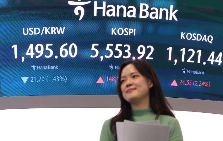 24일 오후 서울 중구 하나은행 딜링룸 현황판에 코스피 지수 등이 표시되고 있다. 이날 코스피는 전장보다 148.17포인트(2.74%) 오른 5,553.92로 거래를 마감했다. 연합뉴스 |