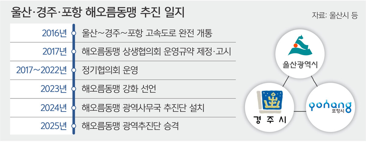 24일 해당 감사 결과에 따르면 행안부는 울산시에 해오름동맹광역추진단 운영과 관련해 개선을 권고했다. 울산시는 2024년 7월 경북 경주·포항과의 연대 사업을 추진하기 위해 해당 추진단을 구성했다. ‘해오름동맹’은 2016년 울산~경주~포항 고속도로(53.7㎞) 전 구간 개통을 계기로 출범한 광역 협력체다. 울산시는 지난해 1월 추진단을 기존 팀장급(5급)에서 과장급(4급)으로 격상했다. 현재 울산시 소속 공무원 3명과 경주·포항에서 각각 3명씩 파견된 인력을 포함해 9명 규모로 운영 중이다.