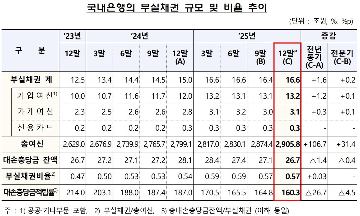 금융감독원은 25일 공개한 2025년 12월 말 기준 국내은행의 부실채권 현황 자료에 따르면 부실채권은 16조6000억원으로 전분기말 16조4000억원 대비 2000억원 증가했다.