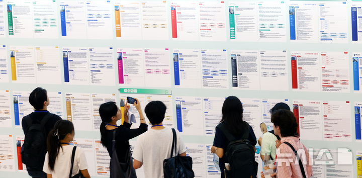 [서울=뉴시스] 박주성 기자 = 20일 서울 동대문디자인플라자(DDP)에서 열린 2025 금융권 공동채용 박람회에서 구직자들이 채용 현황판을 보고 있다. 2025.08.20. park7691@newsis.com |