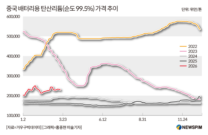 특히 지난해 4분기 빠른 상승으로 12월 배터리용 탄산리튬(순도 99.5%) 주력 계약 가격은 한때 t당 13만 위안을 넘어섰고, 2026년 1월 하순에는 단계적 고점에 도달해 현물 가격이 약 17~18만 위안까지 올랐다. 일부 탄산리튬 가격에 대한 낙관론을 제시하는 외국계 투자자들은 t당 25만 위안까지 오를 수 있다고 예상한다.