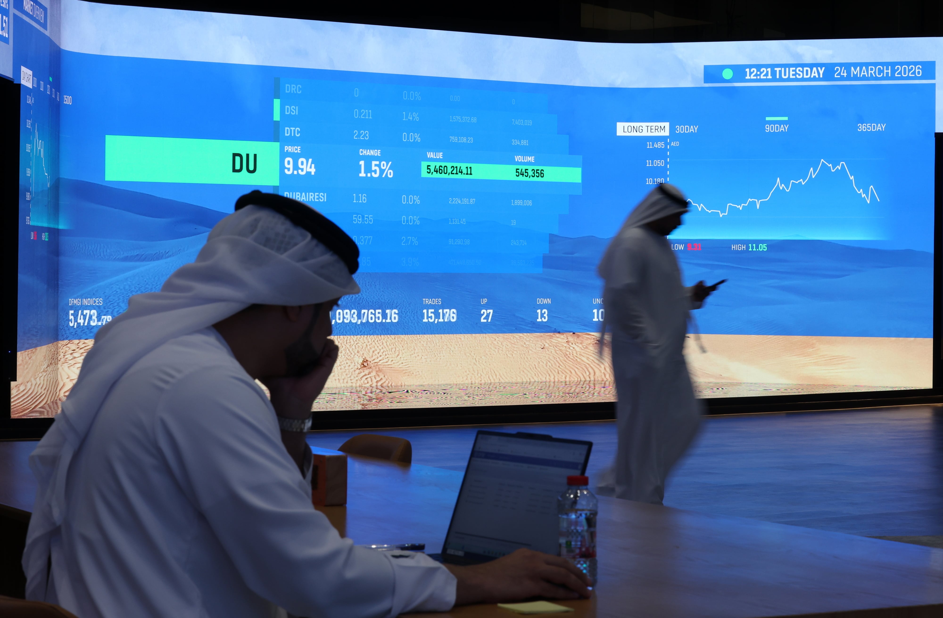 24일 아랍에미리트 두바이의 두바이 금융시장에서 주식 시장을 지켜보고 있는 투자자들. /연합뉴스 |