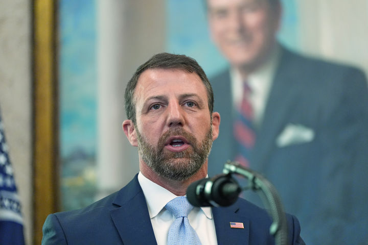 [워싱턴=AP/뉴시스]마크웨인 멀린 신임 국토안보부 장관이 24일(현지 시간) 24일(현지 시간) 백악관 집무실에서 개최된 임명식에서 발언하고 있다. 2026.03.25. |