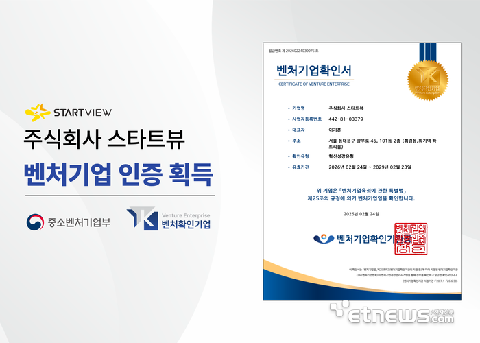 데이터 기반 디지털 마케팅 전문기업 스타트뷰(대표 이기훈)가 중소벤처기업부로부터 '혁신성장유형' 벤처기업 인증을 획득했다고 밝혔다.