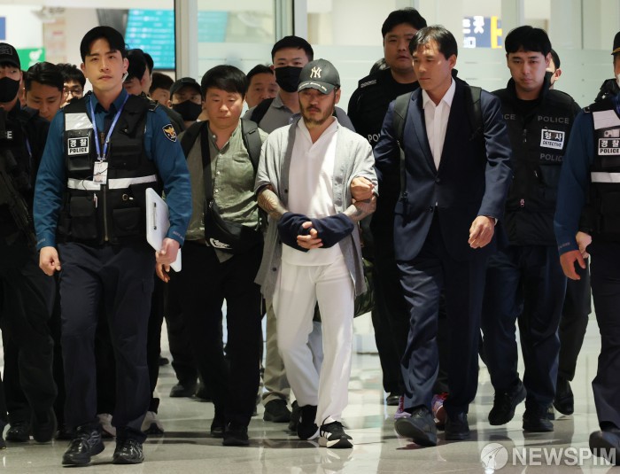[영종도=뉴스핌] 김현우 기자 = 필리핀에서 한국인 3명을 살해한 뒤 교도소 수감 중에도 대규모 마약을 유통한 혐의를 받는 일명 '마약왕' 박왕열 씨가 25일 오전 인천국제공항 제2터미널을 통해 송환되고 있다. 2026.03.25 khwphoto@newspim.com