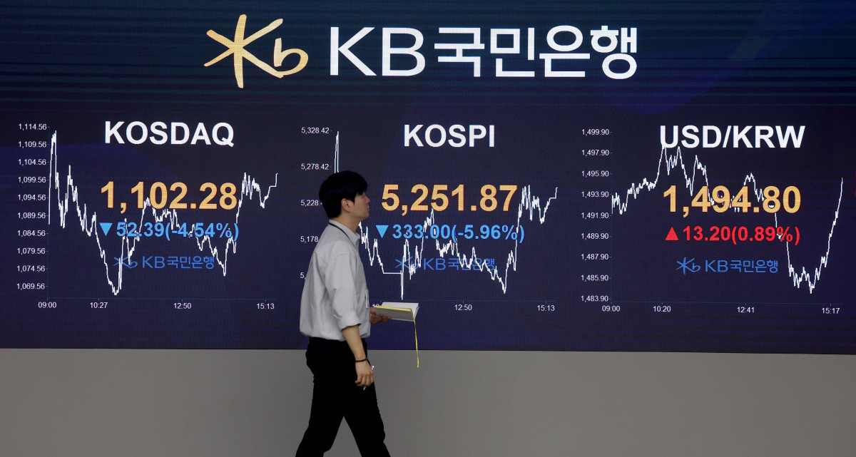 국제유가가 배럴당 100달러를 넘어서면서 국내 경기에도 여파를 줄 수 있다는 우려에 코스피와 코스닥이 크게 떨어진 9일 서울 여의도 KB국민은행 딜링룸 모니터에 코스피 등 시황이 표시되고 있다. 이날 코스피는 전 거래일 대비 333.00포인트(5.96%) 내려앉은 5251.87에 마감했다. 코스닥은 전 거래일 대비 52.39포인트(4.54%) 하락한 1102.28에 거래를 마쳤다. 서울 외환시장에서 원·달러 환율은 전 거래일보다 19.1원 오른 1495.5원에 주간 거래를 마쳤다. 신태현 기자 holjjak@ |