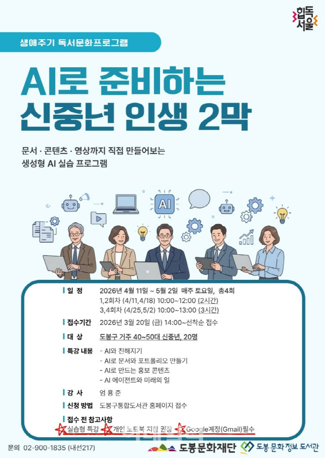 [이데일리 김태형 기자] 도봉구(구청장 오언석)는 도봉문화재단 도봉문화정보도서관에서 중년 대상 인공지능(AI) 실습 프로그램, ‘AI로 준비하는 신중년 인생 2막’을 운영한다고 25일 밝혔다.