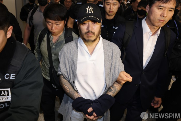 [영종도=뉴스핌] 김현우 기자 = 필리핀에서 한국인 3명을 살해한 뒤 교도소 수감 중에도 대규모 마약을 유통한 혐의를 받는 일명 '마약왕' 박왕열 씨가 25일 오전 인천국제공항 제2터미널을 통해 송환되고 있다. 2026.03.25 khwphoto@newspim.com