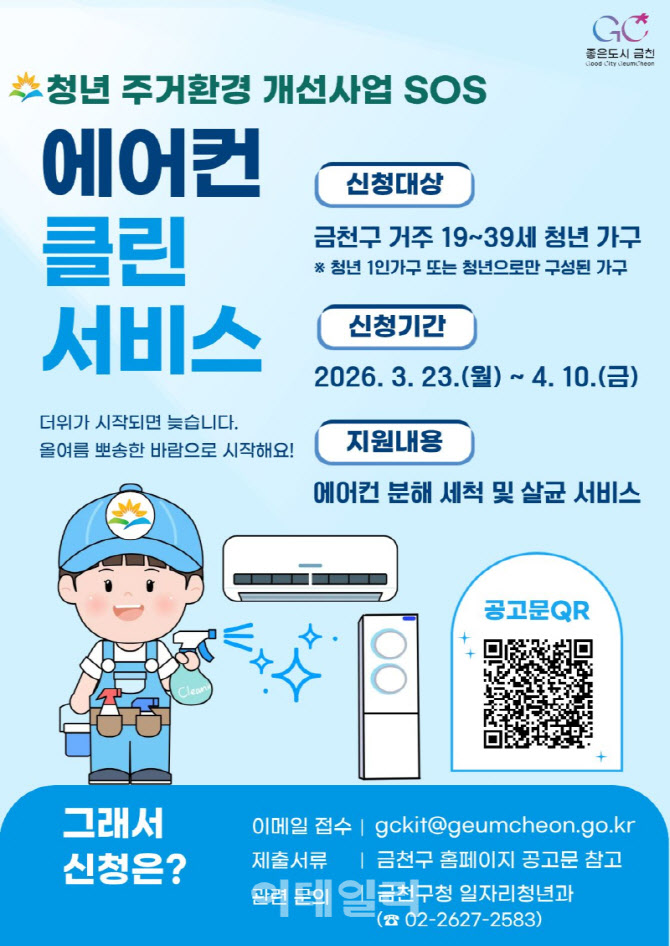 [이데일리 김태형 기자] 금천구(구청장 유성훈)는 여름철을 앞두고 청년가구의 쾌적한 생활환경 조성을 위해 ‘에어컨 클린서비스’ 사업을 추진한다고 25일 밝혔다.
