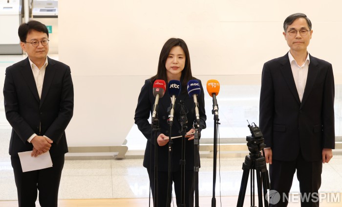 [영종도=뉴스핌] 김현우 기자 = 이지연 국제형사과장이 25일 오전 인천국제공항 제2터미널에서 필리핀 마약왕 박왕열 씨 관련 브리핑을 하고 있다. 2026.03.25 khwphoto@newspim.com