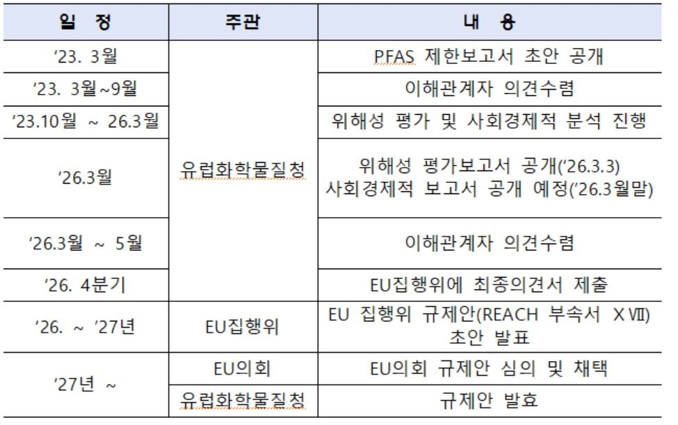 EU는 이달 말 PFAS 규제안에 대한 사회경제적 분석보고서 초안을 공개하고, 이후 60일간 이해관계자 의견수렴 등 규제 입법화를 본격화한다.