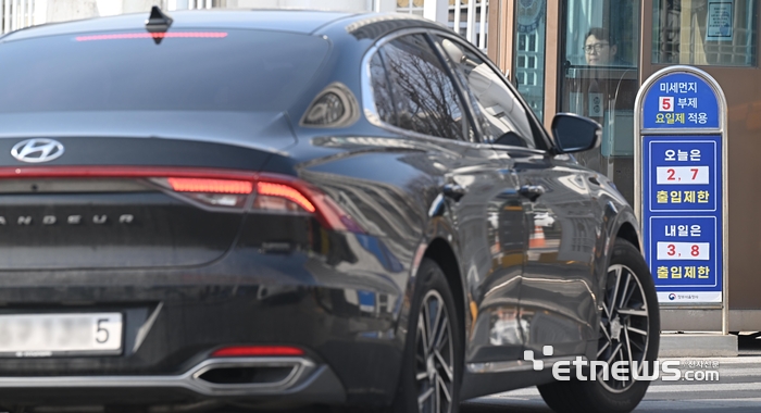 정부가 중동지역 전쟁으로 발생한 에너지 수급 위기에 대비해 공공부문 승용차 5부제(요일제)를 의무적으로 시행한다. 단 전기차나 수소차는 제외한다. 지난 24일 서울 종로구 정부서울청사 출입구에 5부제 안내판에 세워져 있다. [사진= 이동근기자 foto@etnews.com] |