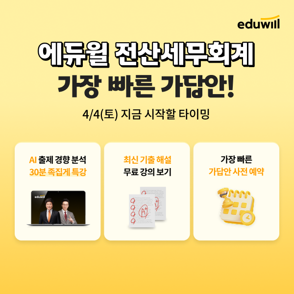 [헤럴드경제=홍석희 기자] 에듀윌은 오는 4월 4일 시행되는 제125회 전산세무회계 시험을 앞두고 수험생들의 합격 예측을 돕기 위한 ‘가답안·가채점 서비스’ 사전예약을 시작했다고 25일 밝혔다.