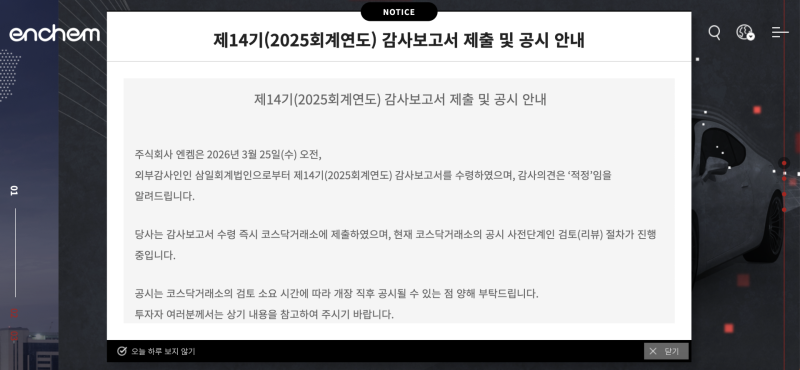 엔켐은 최근 감사보고서 제출이 지연되며 시장의 관심을 받아왔다. 회사는 25일 공식 홈페이지를 통해 외부감사인으로부터 제14기(2025회계연도) 감사보고서를 수령했고 감사의견은 ‘적정’이라고 안내했다. 다만 해당 내용은 거래소 공시가 아닌 회사 측 안내로, 공식 공시는 거래소 검토 절차를 거쳐 이뤄질 예정이다.