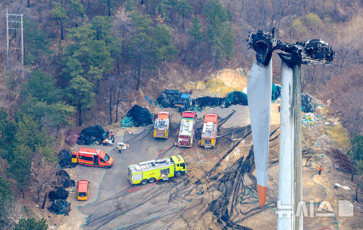 [영덕=뉴시스] 이무열 기자 = 24일 경북 영덕군 영덕읍 창포리 풍력발전단지 내 한 풍력발전기가 전날 화재로 까맣게 탄 채 서 있다. 2026.03.24. lmy@newsis.com |