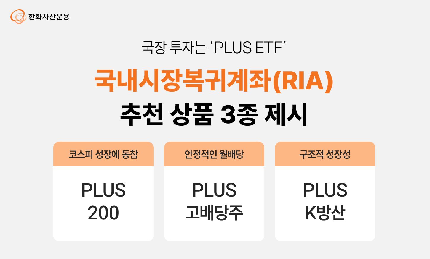 한화자산운용은 국내시장복귀계좌(RIA) 투자에 적합한 PLUS 상장지수펀드(ETF) 3종을 25일 제시했다.