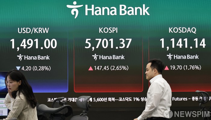 [서울=뉴스핌] 양윤모 기자= 미국과 이란 간 협상 기대감이 커지는 25일 오전 코스피가 전장 종가보다 147.45 포인트(2.65%) 상승하며 5701.37로, 코스닥은 19.70 포인트(1.76%) 상승한 1141.14로 거래를 시작한 가운데, 서울 중구 하나은행 을지로본점 딜링룸에서 직원들이 업무를 보고 있다. 서울외환시장에서 달러/원 환율은 전장 대비 4.20원 하락한 1491.00원에 주간거래를 시작했다. 2026.03.25 yym58@newspim.com