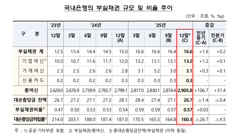 25일 금융감독원이 발표한 '2025년 12월 말 국내은행의 부실채권 현황(잠정)'에 따르면 지난해 12월 말 기준 국내은행의 부실채권(NPL) 비율은 0.57%로 전분기와 동일한 수준을 유지했다. 다만 전년 동기 대비로는 0.03%p 상승했다.