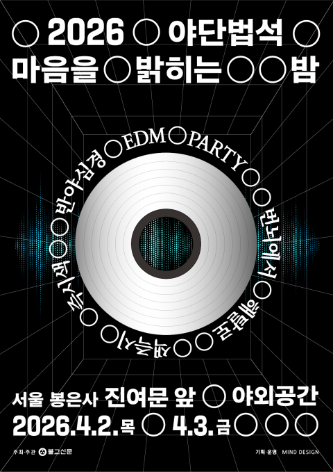 불교신문이 주최하고 마인드디자인이 기획한 '2026 야단법석 - 마음을 밝히는 밤'이 오는 4월 2일부터 3일까지 이틀간 서울 강남 봉은사에서 개최된다. 이번 행사는 반야심경의 핵심 사상인 '공(空)'을 현대적인 감각으로 풀어내 관람객들이 직관적으로 체험할 수 있도록 마련됐다. 행사의 하이라이트인 '반야심경 공(空) 파티'는 봉은사 일주문 앞 특설무대에서 저녁 7시부터 진행된다. 목탁 소리와 반야심경 독송으로 시작해 몰입형 비주얼과 라이브 사운드가 어우러진 공연으로 이어지는 것이 특징이다.