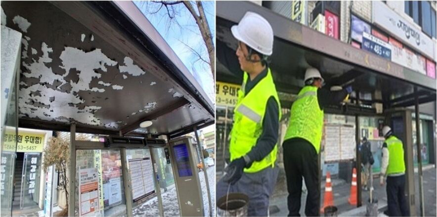 전북 전주시가 운영 중인 ‘생활민원기동처리반’이 선제적인 현장 대응에 나서 페인트가 벗겨져 지저분한 버스 승강장(왼쪽)을 발견하고 재도색하고 있다. 전주시 제공 |
