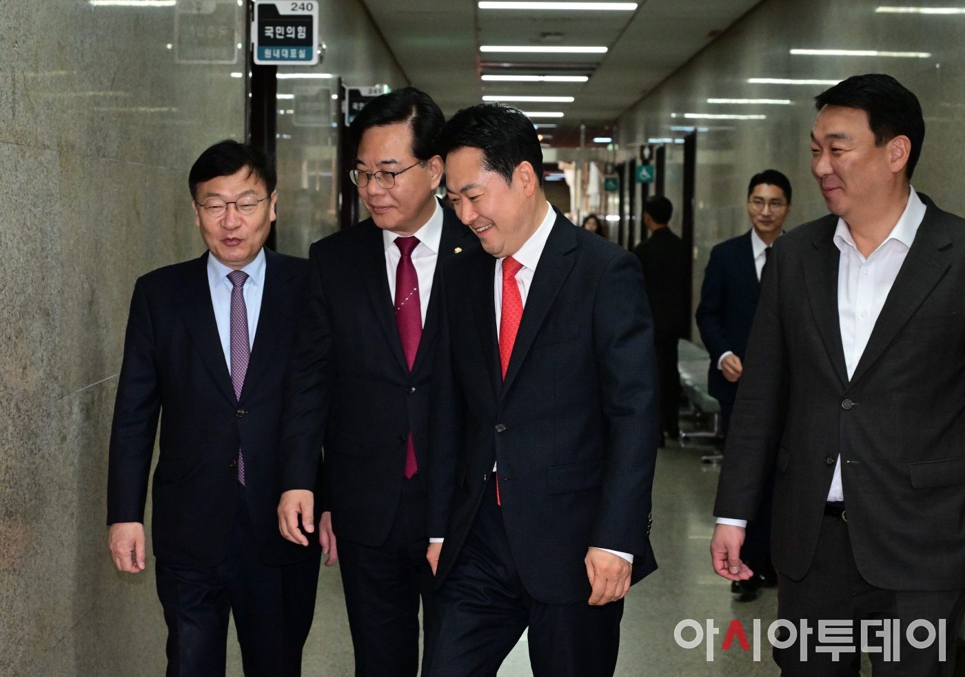 아시아투데이 이병화 기자 = 장동혁 국민의힘 대표와 송언석 원내대표가 25일 국회 당대표실에서 비공개 회의를 마친 뒤 지도부와 함께 원내대표실로 향하고 있다.