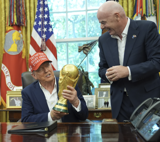 도널드 트럼프 미국 대통령이 지난해 8월 미국 워싱턴DC 백악관 집무실에서 열린 행사에서 잔니 인판티노 FIFA 회장과 대화하며 FIFA 월드컵 우승 트로피를 들어보이고 있다. 워싱턴 로이터 연합뉴스 |