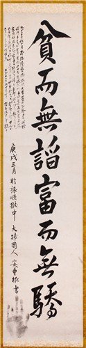 안중근 의사의 기개 담긴 유묵 진본, 가난하되 아첨하지 아니하고 부유하되 교만하지 않다'는 빈이무첨 부이무교(貧而無諂 富而無驕)논어 학이편의 내용을 인용했다. 국가보훈부 제공 |
