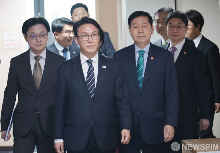 [서울=뉴스핌] 이길동 기자 = 김민석 국무총리가 25일 오전 서울 종로구 정부서울청사에서 비상경제 대응체계 관련 브리핑을 위해 관계부처 장관들과 함께 입장 하고 있다.2026.03.25 gdlee@newspim.com
