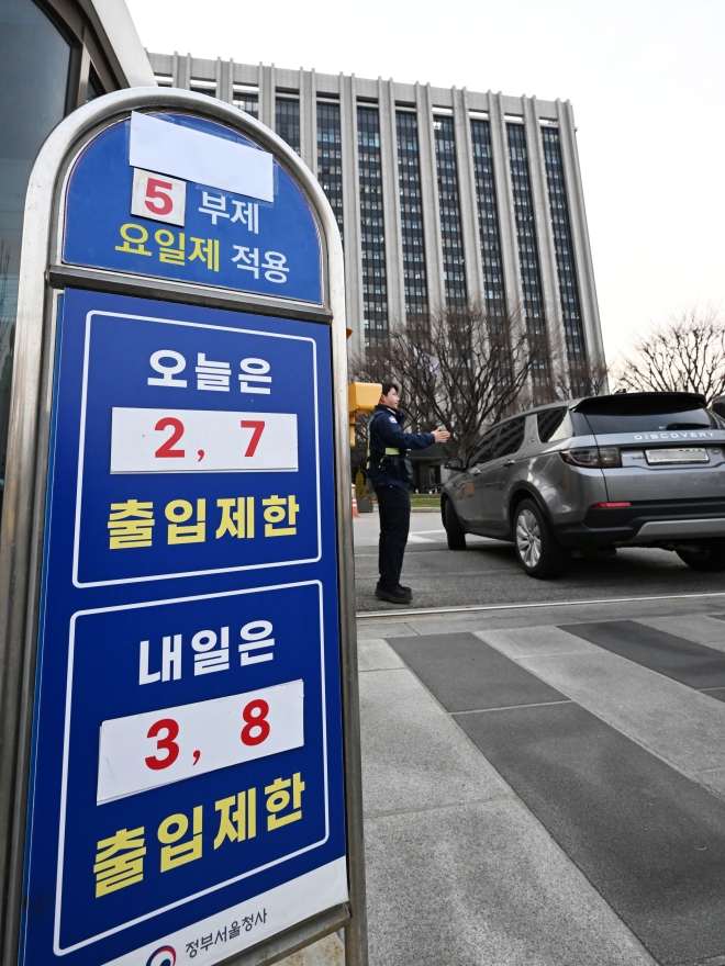 정부가 에너지 절약을 위해 25일부터 공공부문 ‘승용차 5부제(요일제)’를 의무화하기로 한 가운데 24일 정부서울청사 정문 차량 출입구 안내판에 오늘·내일 출입이 제한되는 차량 끝번호가 부착돼 있다.