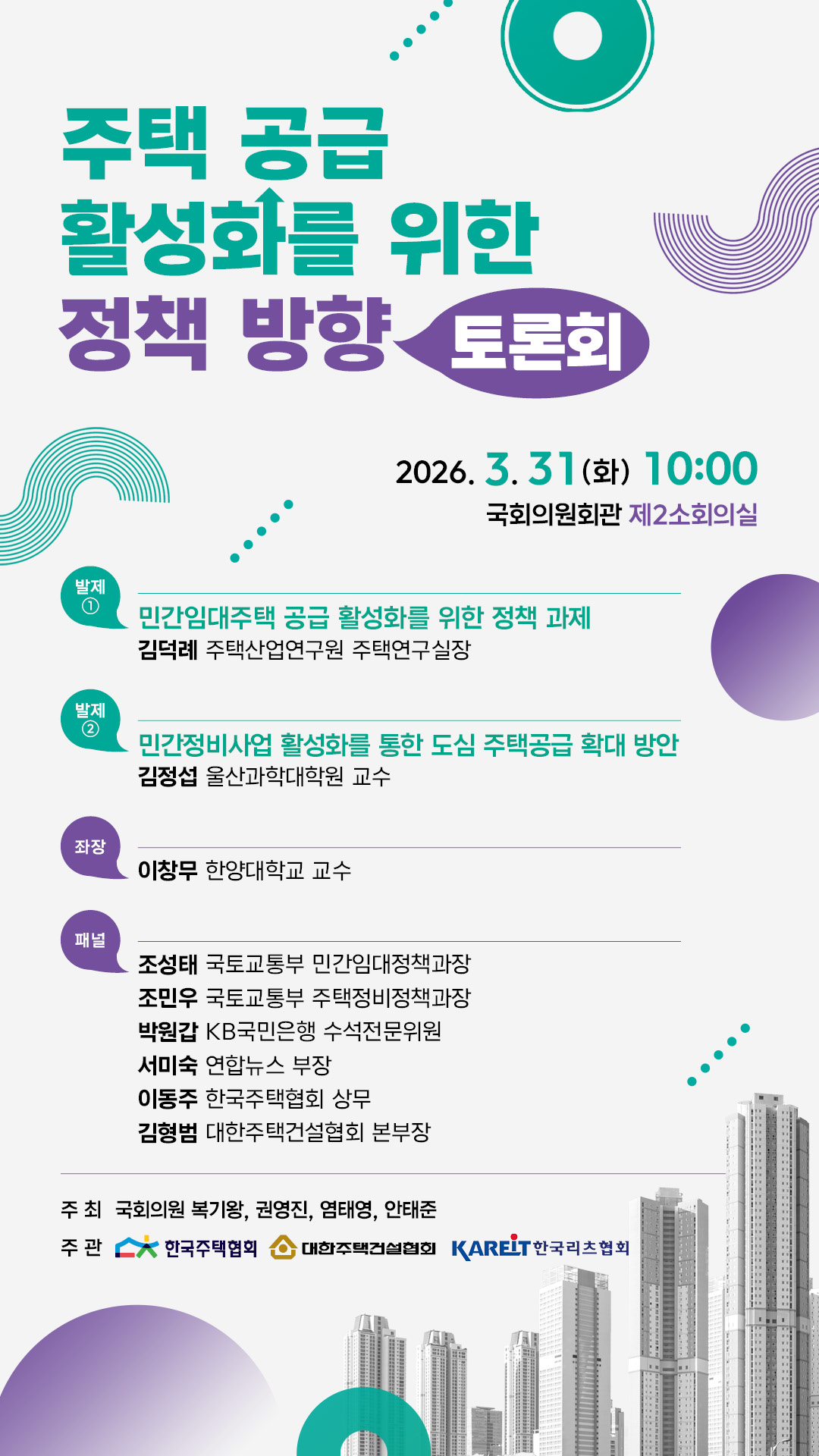 국회 국토교통위원회 소속 복기왕·권영진·염태영·안태준 의원이 공동 주최하고 한국주택협회, 대한주택건설협회, 한국리츠협회가 공동 주관하는 ‘주택공급 활성화를 위한 정책 방향 토론회’가 31일 오전 10시 국회 의원회관 제2소회의실에서 열린다.